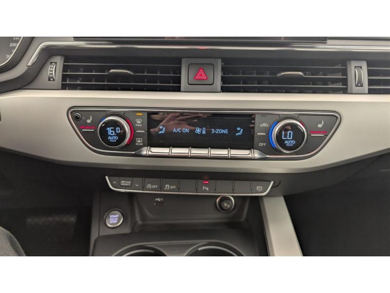 Accoudoir central confort AV avec inclinaison réglable et coulissant en longueurAffichage de contrôle de pression des pneusAirbags grand volume conducteur et passager AVAirbags latéraux à l'AV et système d'airbags de têteApplications décoratives argent flex métalliqueAppui lombaire à 4 axes pour les sièges AV: réglages électrique, horizontal et verticalAudi Drive SelectAudi Parking System PlusAudi Pre Sense cityAudi smartphone interface (Apple CarPlay ou Google Android Auto)Caméra multifonctionChâssis : pour une bonne dynamique de conduite couplée à un confort de conduite souverainClimatisation automatique confort 3 zonesCoffre à ouverture et fermeture électriquesCommande de désactivation de l'airbag passager AVDétecteur de pluie et de luminositéDossier de banquette AR rabattable en 3 parties 40 : 20 : 40 ou complètementEclairage intérieurFeux AR à LEDFixation pour sièges enfants ISOFIX et Top Tether pour les places AR extérieuresFrein de stationnement électromécaniqueInterface BluetoothKeyless Go: démarrage et arrêt du moteur par touche moteur Start/Stop sur la console centraleMMI Radio PlusMoulures de seuil avec insert en aluminium dans les ouvertures des portières AVPare-soleil côtés conducteur et passager AVPhares AV à LED (feux de croisement, feux de route, feux diurnes et feux de position LED, clignotants à ampoule, avec éclairage tout-temps)Plancher de chargement réversibleRéception radio numérique (DAB)Rétroviseur intérieur sans encadrement jour/nuit automatiqueRétroviseurs extérieurs avec feux clignotants à LED intégrés et dans la teinte du véhiculeRecommandation de reposSystème d'information du conducteur avec écran couleur haute résolution de 7"Système Start & StopTire Mobility System Compresseur et produit de colmatage en cas de crevaisonVitres athermiques
