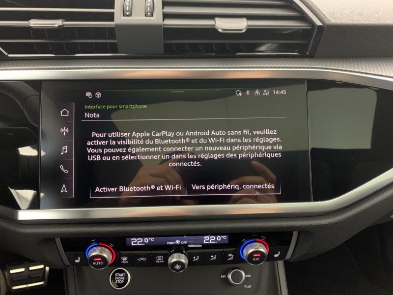 2 prises USB AR (type-C) et prise 12V dans la console centrale ARAccoudoir central coulissant en longueur, avec inclinaison réglable et vide-poches relevableAccoudoirs des contre-portes en matériaux synthétiques monopur 550Affichage de contrôle de pression des pneusAppel d'urgence Audi connectApplications décoratives en aluminium mat Brossé FoncéAppui lombaire à 4 axes pour les sièges AV: réglages électrique, horizontal et verticalAssise et dossier de banquette AR, divisée, rabattable 40/20/40, Assise coulissante en longueur, Dossier avec inclinaison réglableAudi Connect Navigation et Divertissement PlusAudi Connect sécurité et assistance en ligneAudi Drive SelectAudi Hold AssistAudi Pre Sense Basic Déploie automatiquement, lorsque nécessaire, des mesures préventives pour votre sécurité et celle de vos passagers, parmi lesquelles: Resserrement des ceintures de sécurité à l'avant afin de limiter tout déplacAudi Smartphone InterfaceAudi Virtual cockpit plusAvertisseur de franchissement de ligne et avertisseur de changement de voieBanquette AR avec porte-gobelet dans l'accoudoir de la place centraleBoitiers de rétroviseurs extérieurs noirCâbles de recharge pour téléphone portable compatibles Apple et AndroidCaméra de reculCiel de pavillon en tissu NoirClé confort incluant déverrouillage du coffre par capteur (sans Safelock)Détecteur de pluie et de luminositéDétection de signalisation routière par caméraDirection progressiveFixation pour sièges enfants ISOFIX et Top Tether pour les sièges extérieurs ARHayon de coffre à ouverture et fermeture électriqueInterface BluetoothKit réparationMMI Radio Plus avec MMI TouchOutillage de bordPack Aluminium IntérieurPack Eclairage d'ambiance plus En plus du Pack éclairage d'ambiance: - Choix parmi 30 couleurs - Inscription éclairée sur le tableau de bord passager AV (anneaux Audi sur traction ou quattro) : Eclairage dans la zone des pieds AV/AR Eclairage du porte-boissons AV EcPack Esthétique Noir plus - Entourage des vitres latérales avec des baguettes enjoliveuses noir - Calandre Singleframe noire - Pare-chocs AV et AR noirs - Les lames intérieurs de la calandre Singleframe nid d'abeille deviennent noires - Anneaux Audi et monogrammes en NoPack S line extérieur - Pare-chocs S line, enjoliveurs de passage de roue et extensions de bas de caisse en peinture contrastée - Calandre en noir titane, lames intérieures grises - Lamelles en argent aluminium mat - Encadrement des entrées d'air latérales Pack S line intérieur : Pédalier et repose-pieds en acier inoxydable Sièges AV sport Frein à main avec surpiqûres contrastées, couleur assortie à celle de l'habitacle Estampillage S line sur le dossier des sièges AVPare-brise en verre acoustique avec verre feuilleté athermiqueRéception radio numérique (DAB)Rétroviseur intérieur jour/nuit automatique sans encadrementSièges AV réglables manuellement: Hauteur et positionnement en longueur, Inclinaison de dossier, Hauteur des appuie-tête et des ceinturesSièges AV sportSuspensions SportVitrage Privacy : lunette AR, vitres de portières AR et vitres latérales AR surteintéesVolant cuir Sport multifonctions Plus 3 branches avec méplat et palettes de commande au volant