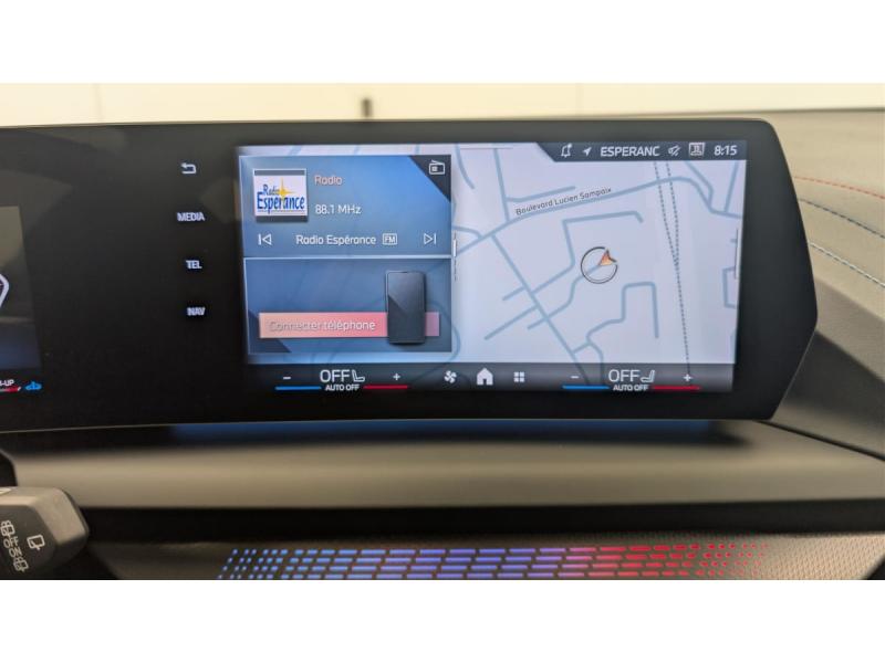 2 porte-gobelets sur la console centrale2 ports USB Type C dans la console centrale + 2 à l'ARAccoudoir central AV avec compartiment de rangementActive Guard - Avertissement de sortie de voie - Avertissement de collision frontale avec intervention sur les freins - Avertissement de virage à gauche (véhicule) avec fonction de freinage - Indicateur de limitation de vitesse - Assistant d'évitementAirbag passager AV déconnectableAirbags de tête AV et aux places latérales ARAirbags frontaux conducteur et passagerAirbags latéraux AVAlarme antivolApple CarPlay / Android AutoBanquette AR rabattable 60/40BMW "My Modes" (Personal/ Efficient/ Sport)BMW Live Cockpit Navigation PlusCiel de pavillon M AnthraciteClimatisation automatique 1 zoneConnectivité BluetoothDémarrage sans clé via le bouton Start/StopDétecteur de pluie et allumage automatique des projecteursDéverrouillage électrique du coffre via la volet de coffre ou la clé radiocommandéeDirection assistéeDriving Assistant - Avertisseur de franchissement de ligne (>70km/h avec vibrations dans le volant) - Avertisseur d'angle mort (>20km/h avec voyant d'alerte) - Avertisseur de risque de collision AV (>15km/h, préconditionnment du freinage >50km/h, assistance au freinageFixation ISOFIXFonction Start&Stop avec système prédictif via la navigationJantes en alliage léger 18" style 975 M, à rayons doubles, bicolores Midnight Grey 8 J x 18 / pneus 225/45 R18. Montage chaînes à neige impossible.Kit de mobilité BMW Bouteille de mastic pour pneumatiques - compresseur électrique 12 V (connexion à une prise 12V)Lève-vitres AV et ARMesure individuelle de pression des pneumatiques avec 3 niveauxParking Assistant - Caméra de recul - Manoeuvres de stationnemment automatique en créneau et en bataille - Freinage automatique (PDC actif) en marche AR - Assistant de marche AR/Auto-reversePrise 12 V dans la console centraleRégulateur de vitesse avec fonction de freinage et limiteur de vitesseRétroviseurs extérieurs couleur carrosserie avec rappels de clignotants intégrésSellerie Alcantara / Similicuir Veganza Schwarz avec surpiqûres bleuesShadow Line M brillant Entourage des vitres latérales, les baguettes de bas de glace, les montants centraux ainsi que les pourtours, pieds et triangles des rétroviseurs extérieurs en noir brillantSièges AV chauffantsSièges AV SportSièges réglables en hauteurSuspension Adaptive MSystème de détection de somnolenceSystème Hi-Fi 6 HPVerrouillage centraliséVolant M gainé cuir (avec surpiqûres noires) Trois branches. Jante en cuir noir 'Walknappa', inserts chrome perlé et repose-pouce dans le volant. Logo M sur la base du volantVolant réglable en hauteur et en profondeur