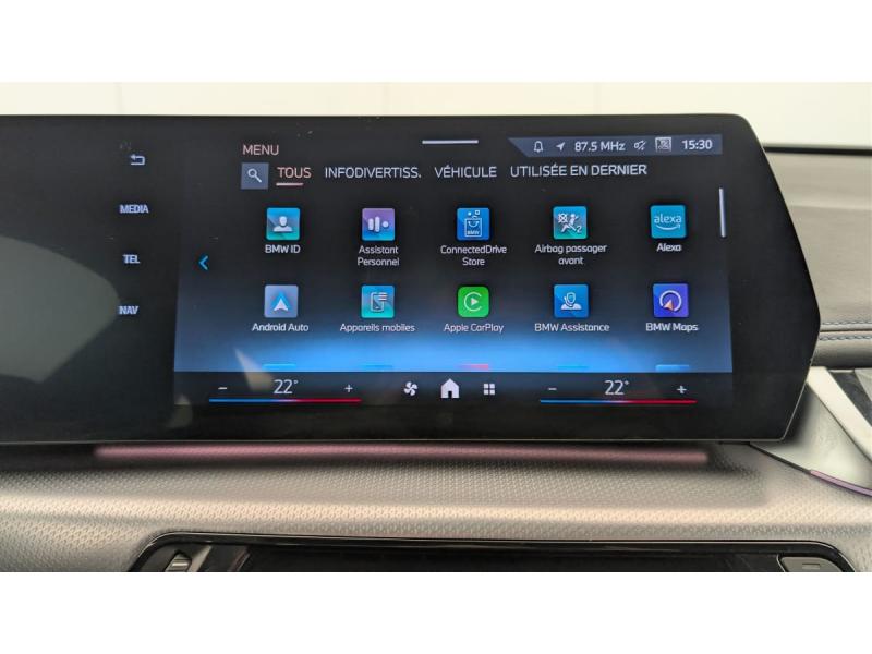 2 porte-gobelets sur la console centrale3ème feu stop LED intégré au spoiler AR5 placesABS - Système anti blocage des rouesAccoudoir central ARAccoudoir central AV avec panneau de commande intégréActive Guard Avertissement de franchissement de ligne avec impulsion sur la direction (>70km/h).Avertisseur de collision frontale avec intervention de freinage (3-210km/h).Avertisseur de présence d'un véhicule lors d'un changement de direction vers la gauche avec action suAirbag entre les deux sièges AV en cas de collision latéraleAirbag passager AV désactivable via la cléAirbags de tête à l'AV et aux places latérales ARAirbags frontaux conducteur et passager AVAirbags latéraux pour conducteur et passager AVAlarme antivolAppel d'Urgence Intelligent (durée de vie de la voiture)Appuis-tête AV et latéraux AR réglables en hauteurAssistant de démarrage en côteBanquette AR rabattable 40/20/40BMW Digital (BMW Maps, RTTI sur itinéraire, Apple CarPlay, Android Auto, BMW Intelligent Personal Assistant)BMW EfficientDynamics Système de récupération de l'énergie au freinage, Fonction d'arrêt et de redémarrage automatique du moteur, Direction à assistance électrique Servotronic (assistance variable selon la vitesse)BMW Live Cockpit Navigation Plus avec Ecran WidescreenBMW Live Cockpit PlusBoîte de vitesses automatique 7 rapports avec palettes au volantBuse de lave-glace pour caméra de reculCapteur d'impact (Activation de l'airbag, des feux de détresse, de l'éclairage intérieur, Déverrouillage des portes, Activation de la borne batterie de sécurité)Carte SIM 4G LTE pour les Services ConnectedDriveCeintures de sécurité 3 points pour toutes les placesCiel de pavillon M AnthraciteClés radiocommandées à mémorisation automatique des réglages "Personal Profile" (x 2)Clignotants LED intégrés aux feux de jourClimatisation automatique 2 zones Contrôle de la température et du volume d'air distribué avec 5 niveaux d'intensité, réglables séparément entre le conducteur et le passager. Fonctionnalité SYNC pour que les réglages du conductCommande électrique du hayon de coffreCompartiment à bagages : 2 crochets de sac, filet sur panneau garuche, prise 12V, rangement additionel au modèle) sous plancher amovibleConnectivité téléphone Bluetooth avec interface USBConsole centrale avec insert noir brillantContour de vitres noir matContrôle automatique de la stabilité (ASC)Contrôle de freinage en courbe CBCContrôle dynamique de stabilité DSCContrôle Dynamique de Traction DTCContrôle dynamique du freinage (DBC)Démarrage sans clé via le bouton Start/StopDésignation du modèle à droite du hayonDétecteur de pluie et allumage automatique des projecteursDirection assistéeEclairage de bienvenue autour du véhiculeEclairage de plaque d'immatriculation à LEDEléments extérieurs M SportEléments intérieur MEquipements supplémentaires Pack M SportESPFeux AR à LED intégrant les clignotantsFeux de sortie de porte AV (porte ouverte)Filtre à particules et catalyseur à oxydationFixations ISOFIX / i-Size pour les deux sièges AR extérieursFonction cargo : Réglage de l'inclinaison de la banquette AR à 12 degrés (volume de chargement supplémentaire d' environ 85-100 litres)Fonction Start&Stop automatiqueFonctionnalité "Follow Me Home" (éclairage d'accompagnement) : les feux de croisement restent allumés quelques instants une fois le contact coupéFrein de parking électromécanique avec fonction "Automatic Hold"Freinage de séchageGrilles de calandre cerclées de chrome avec barreaux verticaux noirsHotSpot Wi-FiInjection directe Common RailInserts décoratifs Aluminium M HexacubeJantes en alliage léger 18" style 838 M Gris foncé. Bicolore 7.5 J x 18 pneus 225/55 R 18. Montage chaînes à neige impossible.Kit éclairage : Eclairage intérieur de l'accoudoir central Lampes de courtoisie Eclairage plancher AV et AR Eclairage du miroir de courtoisie Lampes de lecture centrales Eclairage coffre à bagages sur un côté Eclairage habitacle AV et ARKit de mobilité Plus - Bouteille avec liquide anti-crevaison - Compresseur avec alimentation autonome via batterie rechargeable - Système se fixant au centre de la jante avec maintient de pression automatique du pneu crevé durant la conduite - Simple d'utilisation et r&eKit rangement : Bac de rangement dans les portes AV et AR avec porte-bouteille Compartiment de rangement central Compartiment de rangement avec couvercle rabattable sous l'accoudoir central AV Crochets de vêtements ARLève-vitres AV/AR électriques avec commande par impulsion et sécurité enfantsMesure individuelle de pression des pneumatiquesMy Modes: 5 modes de conduite (Personnel, Efficient, Sport, Relax, Expressive)Notice d'utilisation de la voiture intégrée et carnet d'entretien électronique avec BMW Service HistoryOrdinateur de bord avec Check-Control et indicateur de température extérieurePare-choc AR avec inserts chromés en LPare-choc AV avec air curtains en noir matParking Assistant Comprend l'option Caméra de recul. Manoeuvres de stationnemment en créneau et en bataille facilitées par mesure automatique, Assistant de marche AR/Auto-reversePerformance control : contrôle du moteur et interventions freinage pour améliorer l'agilité et la neutralité en viragePersonal eSIM Personal eSIM est la version électronique, intégrée au véhicule, de la carte SIM traditionnelle. Vous l'utilisez via un abonnement souscrit auprès d'un opérateur téléphonique et transformez ainsi votre BMW en pérPlanche de bord en similicuir Sensatec Habillage de la planche de bord en Sensatec noir avec surpiqûres grise (surpiqûres bleues en combinaison avec une sellerie Alcantara / Sensatec), Parties supérieures du tableau de bord et du panneau de portePoignées de portes affleurantesPorts USB Type C pour la recharge à l'AV (x2) et recharge à l'AR (x2)Prises de courant 12V dans la console centrale AV et dans le coffreRéduction catalytique via injec