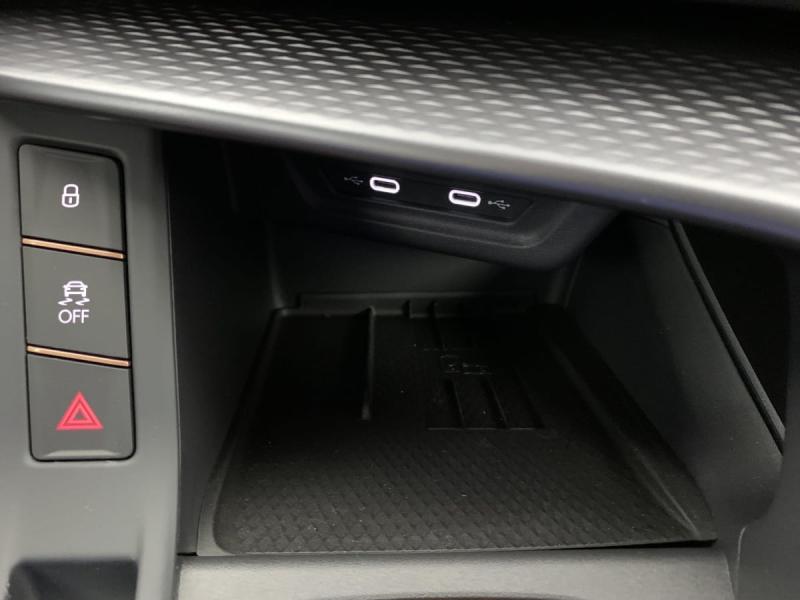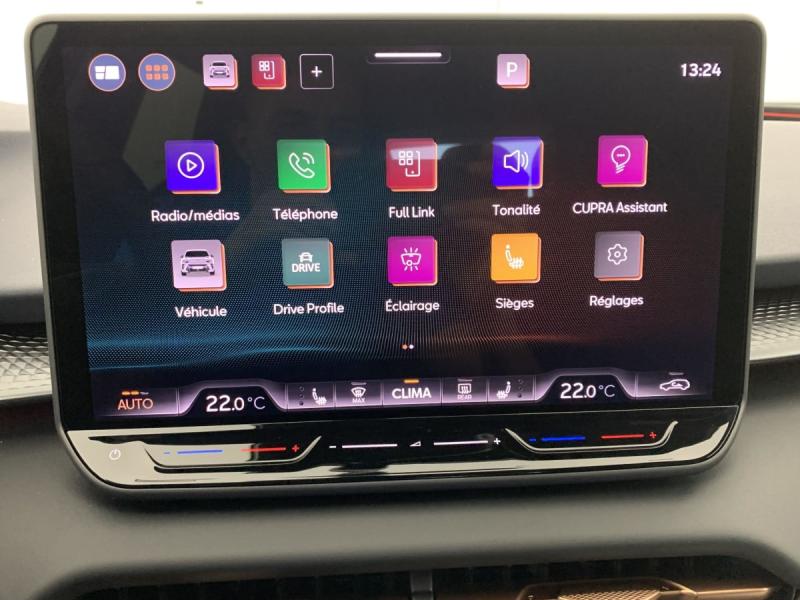 Accès et démarrage mains-libresAccoudoir central AVAide au maintien dans la voie (Lane Assist)Aide au stationnement AV et ARAirbags latéreaux, rideaux et centralAlarme antivol avec fonction SAFEBandeau AR ''Infinite Light'' intégrant le logo CUPRA lumineux avec signature lumineuse Tri-LED et cérémonie de bienvenueBanquette AR coulissante 2/3 - 1/3Caméra de reculCapteur de pluie et de luminositéCiel de pavillon NoirClimatisation automatique tri-zone "Climatronic"Connectivité 4x USB-C et BluetoothConnectivity Box avec chargeur à inductionDétection de fatigue et somnolenceDesign Intérieur Deep Ocean (sièges baquets TEP + textile Bleu Acier) - Logos CUPRA estampés sur les appuie-têtes - Planche de bord bleu acier texturée avec aérateurs cuivrés - Contre-portes en TEP noir texturé - Ciel de pavillon noir - Si&eDigital Cockpit 10,25" simple avec 2 affichages personnalisablesDirection dynamiqueDossiers AR rabattables 2/3 - 1/3Eclairage de bienvenue avec projection du logo CUPRA au solFixations ISOFIX avec Top-Tether à l'ARFront Assist avec détection des piétons et cyclistesFull Link sans fil ( Android Auto + Apple CarPlay)Hayon électrique mains-libres ''Virtual Pedal''Kit de dépannage : compresseur 12 V et produit d'étanchéité de pneuPeinture vernieProjecteurs anti-brouillard avec éclairage d'intersection et éclairage d'accompagnementProjecteurs full LED avec signature lumineuseTri-LEDRégulateur de vitesse adaptatif ACCRétroviseur intérieur électrochromeRétroviseurs extérieurs réglables, rabatable électriquement, dégivant , avec abaissement passager avantRadio numérique DABRails de toit NoirReconnaissance des panneaux de signalisation (Sign Assist)Seuils de porte CUPRA rétro-éclairésSmart Ambient Light (éclairage d'ambiance intérieur intelligent)Système audio à 9 HP avec contrôle vocalSystème d'info-divertissement avec écran tactile HD 12,9'' et touches de commandes tactiles rétro-éclairéesVitres AR surteintéesVolant Supersports CUPRA en cuir avec boutons satellites, chauffant avec palettes de changement de rapport