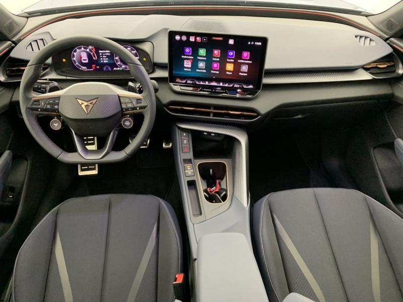Accès et démarrage mains-libresAccoudoir central AVAide au maintien dans la voie (Lane Assist)Aide au stationnement AV et ARAirbags latéreaux, rideaux et centralAlarme antivol avec fonction SAFEBandeau AR ''Infinite Light'' intégrant le logo CUPRA lumineux avec signature lumineuse Tri-LED et cérémonie de bienvenueBanquette AR coulissante 2/3 - 1/3Caméra de reculCapteur de pluie et de luminositéCiel de pavillon NoirClimatisation automatique tri-zone "Climatronic"Connectivité 4x USB-C et BluetoothConnectivity Box avec chargeur à inductionDétection de fatigue et somnolenceDesign Intérieur Deep Ocean (sièges baquets TEP + textile Bleu Acier) - Logos CUPRA estampés sur les appuie-têtes - Planche de bord bleu acier texturée avec aérateurs cuivrés - Contre-portes en TEP noir texturé - Ciel de pavillon noir - Si&eDigital Cockpit 10,25" simple avec 2 affichages personnalisablesDirection dynamiqueDossiers AR rabattables 2/3 - 1/3Eclairage de bienvenue avec projection du logo CUPRA au solFixations ISOFIX avec Top-Tether à l'ARFront Assist avec détection des piétons et cyclistesFull Link sans fil ( Android Auto + Apple CarPlay)Hayon électrique mains-libres ''Virtual Pedal''Kit de dépannage : compresseur 12 V et produit d'étanchéité de pneuPeinture vernieProjecteurs anti-brouillard avec éclairage d'intersection et éclairage d'accompagnementProjecteurs full LED avec signature lumineuseTri-LEDRégulateur de vitesse adaptatif ACCRétroviseur intérieur électrochromeRétroviseurs extérieurs réglables, rabatable électriquement, dégivant , avec abaissement passager avantRadio numérique DABRails de toit NoirReconnaissance des panneaux de signalisation (Sign Assist)Seuils de porte CUPRA rétro-éclairésSmart Ambient Light (éclairage d'ambiance intérieur intelligent)Système audio à 9 HP avec contrôle vocalSystème d'info-divertissement avec écran tactile HD 12,9'' et touches de commandes tactiles rétro-éclairéesVitres AR surteintéesVolant Supersports CUPRA en cuir avec boutons satellites, chauffant avec palettes de changement de rapport