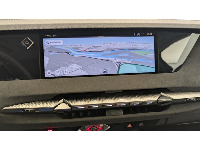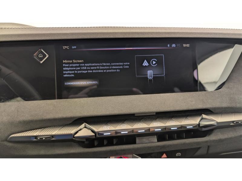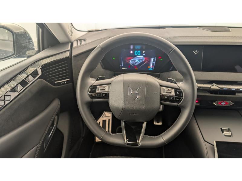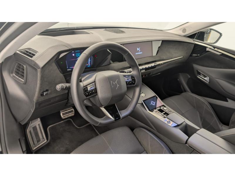ABS avec répartiteur électronique de freinage (REF) et Aide au Freinage d'Urgence (AFU) Avec aide au démarrage en penteAccès et Démarrage mains libres Proximity Déverrouillage et déploiement automatique des poignées de portes affleurantes à l'approche du véhiculeAccoudoir central AR avec 2 porte-gobeletsAccoudoir central AV Avec grand rangement & éclairéAide au stationnement AV et AR et Caméra de reculAirbags frontaux (passager déconnectable), latéraux AV, rideaux aux places AV/AR et central entre les places AVAlerte attention conducteurAlerte de franchissement involontaire de ligne Désactivable via l'écran tactileAllumage automatique des feuxAntenne "aileron de requin" Antenne noir brillantAvertisseur de risque de collisionBanquette AR 2/3 - 1/3 avec 3 appuie-têteClean Cabin avec "Air Quality System"Climatisation automatique bizone 3 modes de diffusion Soft / Normal / Fast. Mode Monozone. Fonction Quick Launch via bouton dédié : froid ou chaud rapide selon la température extérieure. Aérateurs aux places ARCombiné numérique 7"Condamnation automatique des portes et du coffre en roulantConsole centrale avec rangement fermé Avec dépose-téléphone et 2 porte-gobeletsContrôle dynamique de stabilité (ESP) avec antipatinage des roues (ASR) + Contrôle de stabilité de l'attelageDétection de sous-gonflageDS E-Toggle (Sélecteur de vitesses)DS EXTENDED HEAD UP DISPLAY Affichage tete haute étenduDS IRIS SYSTEM Navigation connectée, intégrant un assistant personnel et reconnaissance vocale, avec ChatGPT. Information trafic en temps réel, prix des carburants, parkings et Zones de Danger. 3 ans de services connectés inclusDS MATRIX LED VISION Intègre les technologies Matrix Beam et l'éclairage dynamique en courbe. Grâce aux cinq modes préétablis (ville, campagne, autoroute, météo difficile et brouillard), roulez en pleins phares sans éblouir les autres automEclairage d'ambiance à LED Personnalisable avec 8 couleurs sur les panneaux de portes AV, la planche de bord et le repose paumeEclairage de boîte à gants, d'accoudoir central AV et de coffre à LEDEclairage de cave à pieds à LEDEcran tactile capacitif 10" HDEssuie-vitre AREssuie-vitre AV à déclenchement et cadencement automatiques + Buses de lavageFeux AR Full LED effet 3D avec traitement écaillesFixations ISOFIX aux places latérales AR Inclut un point d'ancrage TOP TETHERFrein de stationnement électrique automatiqueFreinage d'urgence automatique piloté par caméra et radarIntérieur Alcantara Noir : Planche de bord en Alcantara Ciel de pavillon clair Décors de panneaux de porte Chrome guilloché Volant cuir Fleur Mistral Console en toile DS Noir Basalte Panneaux de porte en Alcantara et Toile DS Noir Basalte Sellerie en Tissu Tressé BasalteJantes alliage 19" SEVILLAKit de dépannage provisoire de pneumatiquesLève-vitres AV/AR électriques, séquentiels et antipincementMirror Screen sans fil via Wifi Compatible Apple CarPlay et Android AutoPédalier en aluminiumPack sièges électriques : Réglage lombaire pneumatique Siège conducteur électrique à 10 voies avec mémoire de position, nez de coussin réglable mécaniquement et fonction accueil Siège passager électrique à 6 voiesPalettes au volantPare-brise teinté acoustiquePare-soleil avec miroirs de courtoisie occultables éclairés à LEDRégulateur de vitesse adaptatif et Pack Détection : Adaptive Cruise Control Stop & Go Surveillance d'angles morts longue distance Alerte de Trafic ARRétroviseur intérieur électrochrome sans cadreRétroviseurs extérieurs électriques, dégivrants, rabattables électriquement Avec éclairage d'accueilRadio numérique terrestre (DAB)Reconnaissance étendue des panneaux de circulationSOSVitres AR et lunette AR surteintéesVitres latérales AV/AR feuilletées et acoustiquesVolant réglable en hauteur et profondeur
