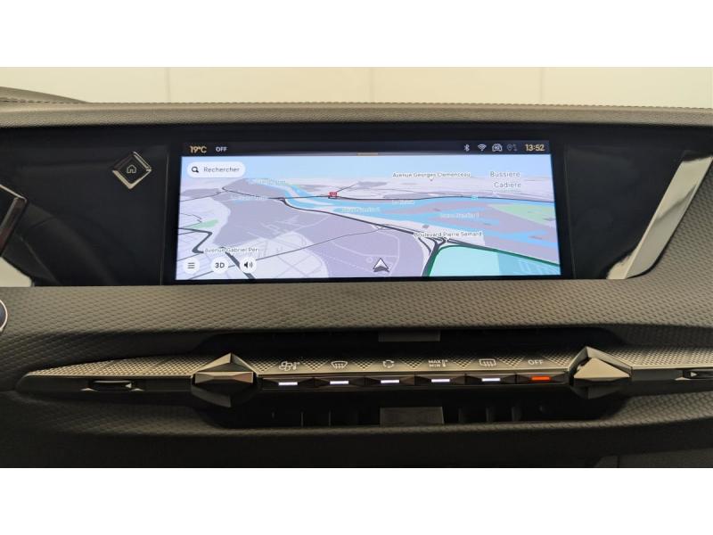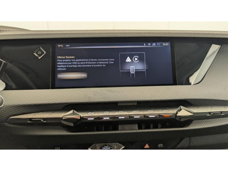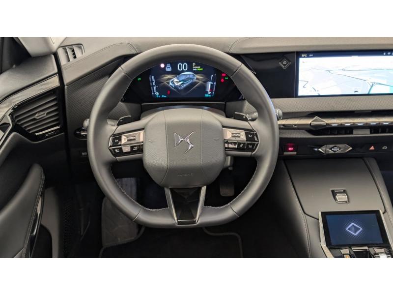 ABS avec répartiteur électronique de freinage (REF) et Aide au Freinage d'Urgence (AFU) + Aide au démarrage en penteAccès et démarrage mains libres ProximityAccoudoir central ARAccoudoir central AVAide au stationnement AV et AR et Caméra de reculAirbags frontaux (passager déconnectable), latéraux AV, rideaux aux places AV/AR et central entre les places AVAllumage automatique des feuxAvertisseur de risque de collisionBanquette AR 2/3 - 1/3 avec 3 appuie-têteClean Cabin avec Air Quality SystemClimatisation automatique bi-zoneCombiné numérique 7"Commutation automatique des feuxCondamnation automatique des portes et du coffre en roulantContrôle dynamique de stabilité (ESP) avec antipatinage des roues (ASR) + Contrôle de stabilité de l'attelageDétection de sous-gonflageDS Drive Assist et Pack Détection Trafic AR : Surveillance d'angles morts longue distance Alerte de Trafic ARDS e-toggle (Sélecteur de vitesses)DS EXTENDED HEAD UP DISPLAY Affichage tete haute étenduDS IRIS SYSTEMDS MATRIX LED VISIONEclairage d'ambiance à LEDEclairage de cave à pieds à LEDEcran tactile capacitif 10" HDEssuie-vitre AV à déclenchement et cadencement automatiques + Buses de lavageFeux AR Full LED effet 3D avec traitement écaillesFixations ISOFIX à la place passager AV et aux places latérales ARFrein de stationnement électrique automatiqueFreinage d'urgence automatique piloté par caméra et radarIntérieur Cuir grainé Noir Basalte et Toile DS : Ciel de pavillon clair Décors de panneaux de porte Chrome guilloché Volant en cuir fleur Mistral Console centrale en Toile DS Mistral Planche de bord en toile DS Noir Basalte façon écaille Panneaux de portes Jantes alliage 19" SEVILLAKit de dépannage provisoire de pneumatiquesLève-vitres AV/AR électriques, séquentiels et antipincementMirror Screen sans fil via Wifi Compatible Apple CarPlay et Android AutoPack Sièges mécaniques avec réglages lombaires conducteur et passagerPalettes au volantPare-brise teinté acoustiquePare-soleil avec miroirs de courtoisie occultables éclairés à LEDRégulateur/Limiteur de vitesse adaptatifRétroviseur intérieur électrochrome sans cadreRétroviseurs extérieurs électriques, dégivrants, rabattables électriquement Avec éclairage d'accueilRadio numérique terrestre (DAB) Inclut le BluetoothReconnaissance des panneaux de vitesse et préconisationSOSVitres AR et lunette AR surteintéesVolant réglable en hauteur et profondeur