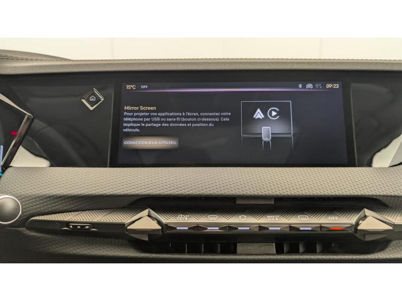 ABS avec répartiteur électronique de freinage (REF) et Aide au Freinage d'Urgence (AFU) + Aide au démarrage en penteAccès et démarrage mains libres ProximityAccoudoir central ARAccoudoir central AVAide au stationnement AV et AR et Caméra de reculAirbags frontaux (passager déconnectable), latéraux AV, rideaux aux places AV/AR et central entre les places AVAllumage automatique des feuxAvertisseur de risque de collisionBanquette AR 2/3 - 1/3 avec 3 appuie-têteClean Cabin avec Air Quality SystemClimatisation automatique bi-zoneCombiné numérique 7"Commutation automatique des feuxCondamnation automatique des portes et du coffre en roulantContrôle dynamique de stabilité (ESP) avec antipatinage des roues (ASR) + Contrôle de stabilité de l'attelageDétection de sous-gonflageDS Drive Assist et Pack Détection Trafic AR : Surveillance d'angles morts longue distance Alerte de Trafic ARDS e-toggle (Sélecteur de vitesses)DS EXTENDED HEAD UP DISPLAY Affichage tete haute étenduDS IRIS SYSTEMDS MATRIX LED VISIONEclairage d'ambiance à LEDEclairage de cave à pieds à LEDEcran tactile capacitif 10" HDEssuie-vitre AV à déclenchement et cadencement automatiques + Buses de lavageFeux AR Full LED effet 3D avec traitement écaillesFixations ISOFIX à la place passager AV et aux places latérales ARFrein de stationnement électrique automatiqueFreinage d'urgence automatique piloté par caméra et radarIntérieur Cuir grainé Noir Basalte et Toile DS : Ciel de pavillon clair Décors de panneaux de porte Chrome guilloché Volant en cuir fleur Mistral Console centrale en Toile DS Mistral Planche de bord en toile DS Noir Basalte façon écaille Panneaux de portes Jantes alliage 19" SEVILLAKit de dépannage provisoire de pneumatiquesLève-vitres AV/AR électriques, séquentiels et antipincementMirror Screen sans fil via Wifi Compatible Apple CarPlay et Android AutoPack Sièges mécaniques avec réglages lombaires conducteur et passagerPalettes au volantPare-brise teinté acoustiquePare-soleil avec miroirs de courtoisie occultables éclairés à LEDRégulateur/Limiteur de vitesse adaptatifRétroviseur intérieur électrochrome sans cadreRétroviseurs extérieurs électriques, dégivrants, rabattables électriquement Avec éclairage d'accueilRadio numérique terrestre (DAB) Inclut le BluetoothReconnaissance des panneaux de vitesse et préconisationSOSVitres AR et lunette AR surteintéesVolant réglable en hauteur et profondeur