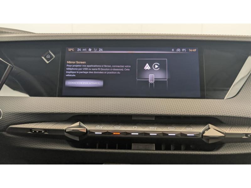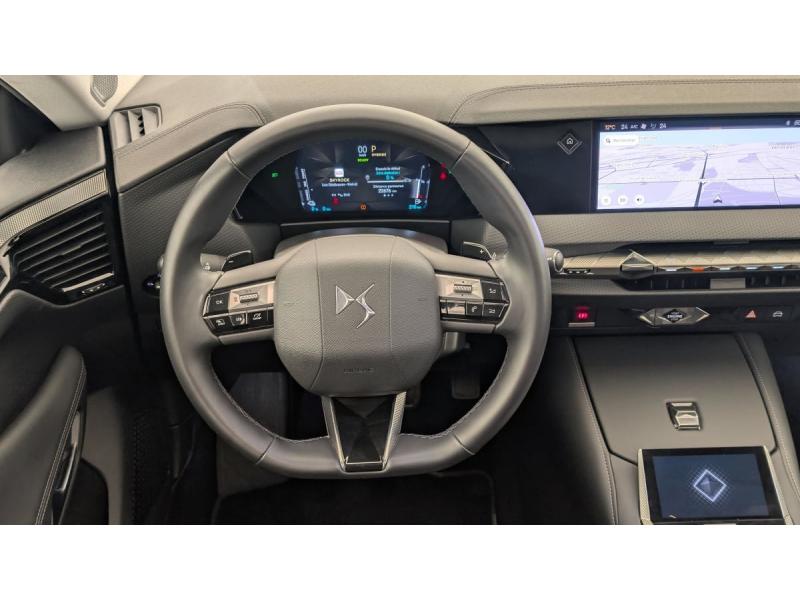 ABS avec répartiteur électronique de freinage (REF) et Aide au Freinage d'Urgence (AFU) + Aide au démarrage en penteAccès et démarrage mains libres ProximityAccoudoir central ARAccoudoir central AVAide au stationnement AV/AR avec Caméra de reculAirbags frontaux (passager déconnectable), latéraux AV, rideaux aux places AV/AR et central entre les places AVAlerte Attention ConducteurAlerte de franchissement involontaire de ligneAllumage automatique des feuxAvertisseur de risque de collisionBanquette AR 2/3 - 1/3 avec 3 appuie-têteBoîte à gantsCâble de recharge mode 2 standard 1,8 kW (10 A)Chargeur embarqué monophasé de 7,4 kWClean Cabin avec Air Quality SystemClimatisation automatique bi-zoneCombiné numérique 7"Commutation automatique des feuxCondamnation automatique des portes et du coffre en roulantConsole centrale avec rangement ferméContrôle dynamique de stabilité (ESP) avec antipatinage des roues (ASR) + Contrôle de stabilité de l'attelageCoques de rétroviseurs extérieurs noir brillantDétection de sous-gonflageDiffuseur AR noir brillant avec décors d'échappement chroméDS Drive Assist et Pack Détection Trafic AR : Surveillance d'angles morts longue distance Alerte de Trafic AR Adaptive Cruise Control with Stop&GoDS EXTENDED HEAD UP DISPLAYDS IRIS SYSTEMDS MATRIX LED VISIONEclairage d'ambiance à LEDEclairage de boîte à gants, d'accoudoir central AV et de coffre à LEDEclairage de cave à pieds à LEDEcran tactile capacitif 10" HDEnjoliveurs supérieurs des vitres latérales chromésEssuie-vitre AV à déclenchement et cadencement automatiques + Buses de lavageFeux AR Full LED effet 3D avec traitement écaillesFixations ISOFIX à la place passager AV et aux places latérales ARFrein de stationnement électrique automatiqueFreinage d'urgence automatique piloté par caméra et radarIntérieur Cuir grainé Noir Basalte : Sellerie en Cuir grainé Noir Basalte Décors de panneaux de porte Chrome guilloché Volant en cuir fleur Mistral Console centrale en Toile DS Mistral Planche de bord en toile DS Noir Basalte façon écaille Panneaux dJantes alliage 19" SEVILLAKit de dépannage provisoire de pneumatiquesLève-vitres AV/AR électriques, séquentiels et antipincementMirror Screen sans fil via Wifi Compatible Apple CarPlay et Android AutoPalettes au volantPare-brise teinté acoustiquePare-soleil avec miroirs de courtoisie occultables éclairés à LEDPrises 12 V 1 prise AV et 1 prise dans le coffrePrises USB 1 prise USB-C sous l'accoudoir central AV, 1 prise USB-C dans la console et 2 prises USB-C pour les passagers ARRétroviseur intérieur électrochrome sans cadreRadio numérique terrestre (DAB) Inclut le BluetoothReconnaissance des panneaux de vitesse et préconisationSOSVitres AR et lunette AR surteintéesVolant réglable en hauteur et profondeur