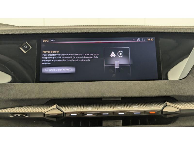 ABS avec répartiteur électronique de freinage (REF) et Aide au Freinage d'Urgence (AFU) + Aide au démarrage en penteAccès et démarrage mains libres ProximityAccoudoir central AR avec 2 porte-gobeletsAdaptive Cruise Control Stop&GoAide au stationnement AV/AR avec Caméra de reculAirbags frontaux (passager déconnectable), latéraux AV, rideaux aux places AV/AR et central entre les places AVAlerte Attention ConducteurAlerte de franchissement involontaire de ligneAllumage automatique des feuxAvertisseur de risque de collisionBanquette AR 2/3 - 1/3 avec 3 appuie-têteBoîte à gantsClimatisation automatique bi-zoneCombiné numérique 7"Condamnation automatique des portes et du coffre en roulantContrôle dynamique de stabilité (ESP) avec antipatinage des roues (ASR) + Contrôle de stabilité de l'attelageDétection de sous-gonflageDS EXTENDED HEAD UP DISPLAYDS IRIS SYSTEMDS MATRIX LED VISIONEclairage d'ambiance à LEDEclairage de boîte à gants, d'accoudoir central AV et de coffre à LEDEclairage de cave à pieds à LEDEcran tactile capacitif 10" HDEssuie-vitre AV à déclenchement et cadencement automatiques + Buses de lavageFeux AR Full LED effet 3D avec traitement écaillesFixations ISOFIX à la place passager AV et aux places latérales ARFrein de stationnement électrique automatiqueFreinage d'urgence automatique piloté par caméra et radarIntérieur Tissu Tressé Basalte avec Alcantara : Planche de bord en alcantara Panneaux de portes en alcantara Console centrale en alcantara Sellerie en Tissu Tressé Basalte avec Alcantara et toile DS Décors de panneaux de porte Chrome guilloché Volant en cuir fleurJantes alliage 19" MINNEAPOLISKit de dépannage provisoire de pneumatiquesLève-vitres AV/AR électriques, séquentiels et antipincementLunette AR chauffanteMirror Screen sans fil via Wifi Compatible Apple CarPlay et Android AutoPack Style : Pédalier en aluminium Vitres AR et lunette AR surteintéesPalettes au volantPare-brise teinté acoustiquePare-soleil avec miroirs de courtoisie occultables éclairés à LEDRétroviseur intérieur électrochrome sans cadreRétroviseurs extérieurs électriques, dégivrants, rabattables électriquement Avec éclairage d'accueilRadio numérique terrestre (DAB) Inclut le BluetoothReconnaissance étendue des panneaux de circulationReconnaissance des panneaux de vitesse et préconisationVitres AR et lunette AR surteintéesVolant réglable en hauteur et profondeur