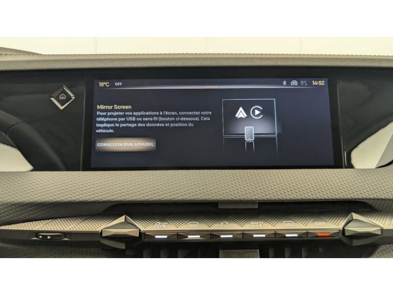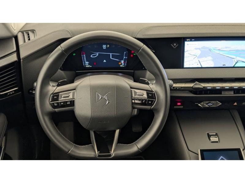 ABS avec répartiteur électronique de freinage (REF) et Aide au Freinage d'Urgence (AFU) + Aide au démarrage en penteAccès et démarrage mains libres ProximityAccoudoir central AR avec trappe à ski et 2 porte-gobeletsAide au stationnement AV et AR et Caméra de reculAirbags frontaux (passager déconnectable), latéraux AV, rideaux aux places AV/AR et central entre les places AVAlerte Attention ConducteurAlerte de franchissement involontaire de ligneAllumage automatique des feuxAntenne "aileron de requin"Avertisseur de risque de collisionBanquette AR 2/3 - 1/3 avec 3 appuie-têteClimatisation automatique bi-zoneCombiné numérique 7"Commutation automatique des feuxCondamnation automatique des portes et du coffre en roulantConsole centrale avec rangement ferméContrôle dynamique de stabilité (ESP) avec antipatinage des roues (ASR)Détection de sous-gonflageDS Drive Assist et Pack Détection Trafic AR : Adaptive Cruise Control Stop & Go Surveillance d'angles morts longue distance Alerte de Trafic AR Lane Positioning Assist afin de gérer la conduite de manière semi-autonomeDS e-toggle (Sélecteur de vitesses)DS EXTENDED HEAD UP DISPLAY Affichage tete haute étenduDS IRIS SYSTEMDS MATRIX LED VISIONEclairage d'ambiance à LEDEclairage de boîte à gants, d'accoudoir central AV et de coffre à LEDEclairage de cave à pieds à LEDEcran tactile capacitif 10" HDEssuie-vitre AV à déclenchement et cadencement automatiques + Buses de lavageFeux AR Full LED effet 3D avec traitement écaillesFixations ISOFIX à la place passager AV et aux places latérales ARFrein de stationnement électrique automatiqueFreinage d'urgence automatique piloté par caméra et radarIntérieur Cuir grainé Noir Basalte et Toile DS : Ciel de pavillon clair Décors de panneaux de porte Chrome guilloché Volant en cuir fleur Mistral Console centrale en Toile DS Mistral Planche de bord en toile DS Noir Basalte façon écaille Panneaux de portes Jantes alliage 19" SEVILLAKit de dépannage provisoire de pneumatiquesLève-vitres AV/AR électriques, séquentiels et antipincementMirror Screen sans fil via Wifi Compatible Apple CarPlay et Android AutoPack Sièges mécaniques avec réglages lombaires conducteur et passagerPalettes au volantPare-brise teinté acoustiquePare-soleil avec miroirs de courtoisie occultables éclairés à LEDPrises USB 1 prise USB-C sous l'accoudoir central AV, 1 prise USB-C dans la console et 2 prises USB-C pour les passagers ARRétroviseur intérieur électrochrome sans cadreRétroviseurs extérieurs électriques, dégivrants, rabattables électriquement Avec éclairage d'accueilRadio numérique terrestre (DAB) Inclut le BluetoothReconnaissance étendue des panneaux de circulationReconnaissance des panneaux de vitesse et préconisationVitres AR et lunette AR surteintéesVolant réglable en hauteur et profondeur