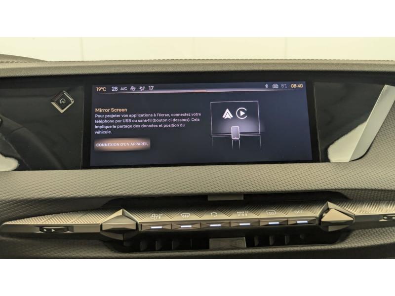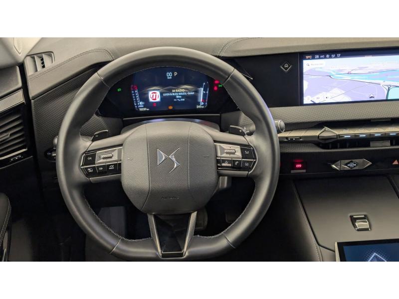 ABS avec répartiteur électronique de freinage (REF) et Aide au Freinage d'Urgence (AFU) + Aide au démarrage en penteAccès et démarrage mains libres ProximityAccoudoir central AR avec trappe à ski et 2 porte-gobeletsAide au stationnement AV et AR et Caméra de reculAirbags frontaux (passager déconnectable), latéraux AV, rideaux aux places AV/AR et central entre les places AVAlerte Attention ConducteurAlerte de franchissement involontaire de ligneAllumage automatique des feuxAvertisseur de risque de collisionBanquette AR 2/3 - 1/3 avec 3 appuie-têteClimatisation automatique bi-zoneCombiné numérique 7"Commutation automatique des feuxCondamnation automatique des portes et du coffre en roulantDétection de sous-gonflageDS Drive Assist et Pack Détection Trafic AR : Surveillance d'angles morts longue distance Alerte de Trafic ARDS e-toggle (Sélecteur de vitesses)DS EXTENDED HEAD UP DISPLAY Affichage tete haute étenduDS IRIS SYSTEMDS MATRIX LED VISIONEclairage d'ambiance à LEDEclairage de boîte à gants, d'accoudoir central AV et de coffre à LEDEclairage de cave à pieds à LEDEcran tactile capacitif 10" HDEssuie-vitre AV à déclenchement et cadencement automatiques + Buses de lavageFeux AR Full LED effet 3D avec traitement écaillesFixations ISOFIX à la place passager AV et aux places latérales ARFrein de stationnement électrique automatiqueFreinage d'urgence automatique piloté par caméra et radarIntérieur Cuir grainé Noir Basalte et Toile DS : Ciel de pavillon clair Décors de panneaux de porte Chrome guilloché Volant en cuir fleur Mistral Console centrale en Toile DS Mistral Planche de bord en toile DS Noir Basalte façon écaille Panneaux de portes Jantes alliage 19" SEVILLAKit de dépannage provisoire de pneumatiquesLève-vitres AV/AR électriques, séquentiels et antipincementMirror Screen sans fil via Wifi Compatible Apple CarPlay et Android AutoPack Sièges mécaniques avec réglages lombaires conducteur et passagerPalettes au volantPare-brise teinté acoustiqueRégulateur/Limiteur de vitesse adaptatifRétroviseur intérieur électrochrome sans cadreRétroviseurs extérieurs électriques, dégivrants, rabattables électriquement Avec éclairage d'accueilRadio numérique terrestre (DAB) Inclut le BluetoothReconnaissance étendue des panneaux de circulationReconnaissance des panneaux de vitesse et préconisationVitres AR et lunette AR surteintéesVolant réglable en hauteur et profondeur