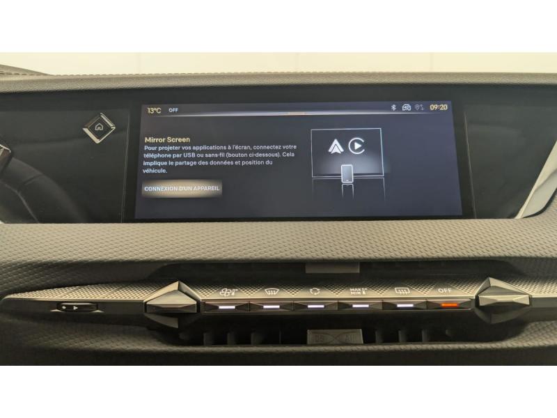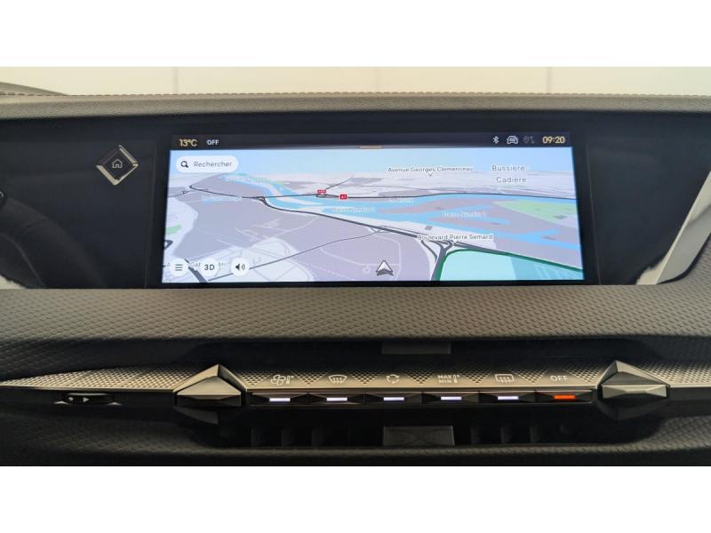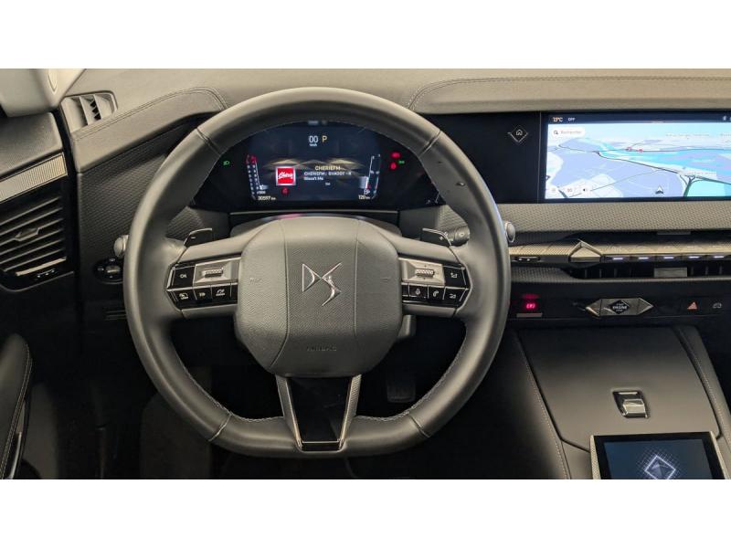ABS avec répartiteur électronique de freinage (REF) et Aide au Freinage d'Urgence (AFU) + Aide au démarrage en penteAccès et démarrage mains libres ProximityAccoudoir central ARAccoudoir central AVAide au stationnement AV et AR et Caméra de reculAirbags frontaux (passager déconnectable), latéraux AV, rideaux aux places AV/AR et central entre les places AVAlerte de franchissement involontaire de ligneAllumage automatique des feuxBanquette AR 2/3 - 1/3 avec 3 appuie-têteClean Cabin avec Air Quality SystemClimatisation automatique bi-zoneCombiné numérique 7"Commutation automatique des feuxCondamnation automatique des portes et du coffre en roulantContrôle dynamique de stabilité (ESP) avec antipatinage des roues (ASR) + Contrôle de stabilité de l'attelageDétection de sous-gonflageDS Drive Assist et Pack Détection Trafic AR : Adaptive Cruise Control Stop & Go Surveillance d'angles morts longue distance Alerte de Trafic AR Lane Positioning Assist afin de gérer la conduite de manière semi-autonomeDS e-toggle (Sélecteur de vitesses)DS EXTENDED HEAD UP DISPLAY Affichage tete haute étenduDS IRIS SYSTEMDS MATRIX LED VISIONEclairage d'ambiance à LEDEclairage de boîte à gants, d'accoudoir central AV et de coffre à LEDEclairage de cave à pieds à LEDEcran tactile capacitif 10" HDEssuie-vitre AV à déclenchement et cadencement automatiques + Buses de lavageFeux AR Full LED effet 3D avec traitement écaillesFixations ISOFIX à la place passager AV et aux places latérales ARFrein de stationnement électrique automatiqueFreinage d'urgence automatique piloté par caméra et radarIntérieur Cuir grainé Noir Basalte et Toile DS : Ciel de pavillon clair Décors de panneaux de porte Chrome guilloché Volant en cuir fleur Mistral Console centrale en Toile DS Mistral Planche de bord en toile DS Noir Basalte façon écaille Panneaux de portes Jantes alliage 19" SEVILLAKit de dépannage provisoire de pneumatiquesLève-vitres AV/AR électriques, séquentiels et antipincementLunette AR chauffanteMirror Screen sans fil via Wifi Compatible Apple CarPlay et Android AutoPack Sièges mécaniques avec réglages lombaires conducteur et passagerPalettes au volantPare-brise teinté acoustiquePare-soleil avec miroirs de courtoisie occultables éclairés à LEDRétroviseur intérieur électrochrome sans cadreRétroviseurs extérieurs électriques, dégivrants, rabattables électriquement Avec éclairage d'accueilRadio numérique terrestre (DAB) Inclut le BluetoothReconnaissance des panneaux de vitesse et préconisationSOSVitres AR et lunette AR surteintéesVolant réglable en hauteur et profondeur