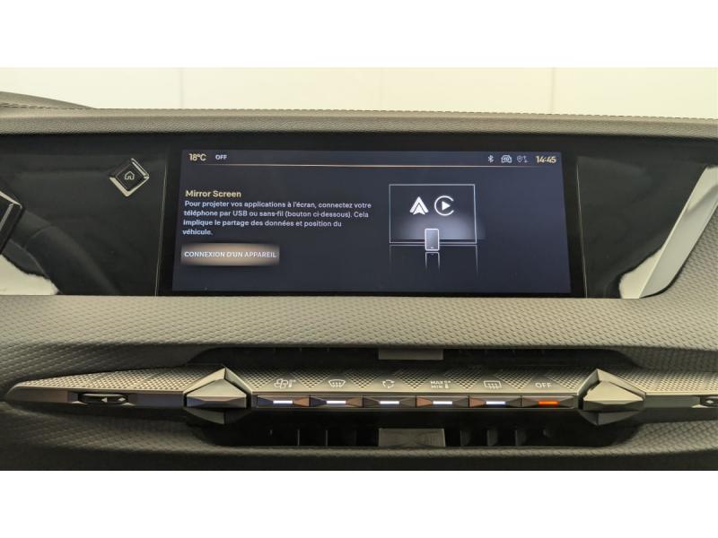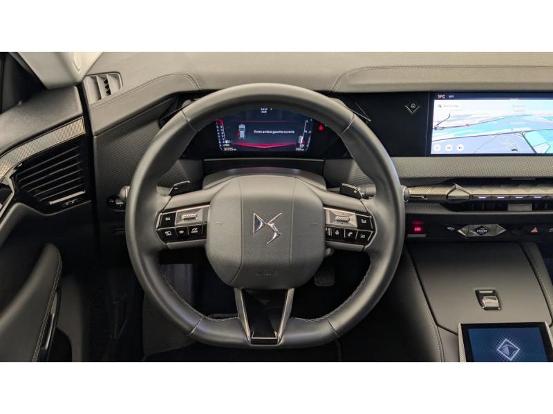 ABS avec répartiteur électronique de freinage (REF) et Aide au Freinage d'Urgence (AFU) + Aide au démarrage en penteAccès et démarrage mains libres ProximityAccoudoir central ARAccoudoir central AVAide au stationnement AV et AR et Caméra de reculAirbags frontaux (passager déconnectable), latéraux AV, rideaux aux places AV/AR et central entre les places AVAlerte de franchissement involontaire de ligneAllumage automatique des feuxBanquette AR 2/3 - 1/3 avec 3 appuie-têteClean Cabin avec Air Quality SystemClimatisation automatique bi-zoneCombiné numérique 7"Commutation automatique des feuxCondamnation automatique des portes et du coffre en roulantContrôle dynamique de stabilité (ESP) avec antipatinage des roues (ASR) + Contrôle de stabilité de l'attelageDétection de sous-gonflageDS Drive Assist et Pack Détection Trafic AR : Adaptive Cruise Control Stop & Go Surveillance d'angles morts longue distance Alerte de Trafic AR Lane Positioning Assist afin de gérer la conduite de manière semi-autonomeDS e-toggle (Sélecteur de vitesses)DS EXTENDED HEAD UP DISPLAY Affichage tete haute étenduDS IRIS SYSTEMDS MATRIX LED VISIONEclairage d'ambiance à LEDEclairage de boîte à gants, d'accoudoir central AV et de coffre à LEDEclairage de cave à pieds à LEDEcran tactile capacitif 10" HDEssuie-vitre AV à déclenchement et cadencement automatiques + Buses de lavageFeux AR Full LED effet 3D avec traitement écaillesFixations ISOFIX à la place passager AV et aux places latérales ARFrein de stationnement électrique automatiqueFreinage d'urgence automatique piloté par caméra et radarIntérieur Cuir grainé Noir Basalte et Toile DS : Ciel de pavillon clair Décors de panneaux de porte Chrome guilloché Volant en cuir fleur Mistral Console centrale en Toile DS Mistral Planche de bord en toile DS Noir Basalte façon écaille Panneaux de portes Jantes alliage 19" SEVILLAKit de dépannage provisoire de pneumatiquesLève-vitres AV/AR électriques, séquentiels et antipincementLunette AR chauffanteMirror Screen sans fil via Wifi Compatible Apple CarPlay et Android AutoPack Sièges mécaniques avec réglages lombaires conducteur et passagerPalettes au volantPare-brise teinté acoustiquePare-soleil avec miroirs de courtoisie occultables éclairés à LEDRétroviseur intérieur électrochrome sans cadreRétroviseurs extérieurs électriques, dégivrants, rabattables électriquement Avec éclairage d'accueilRadio numérique terrestre (DAB) Inclut le BluetoothReconnaissance des panneaux de vitesse et préconisationSOSVitres AR et lunette AR surteintéesVolant réglable en hauteur et profondeur