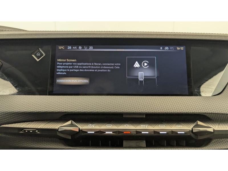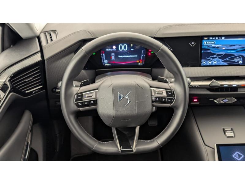ABS avec répartiteur électronique de freinage (REF) et Aide au Freinage d'Urgence (AFU) + Aide au démarrage en penteAccès et démarrage mains libres ProximityAccoudoir central ARAccoudoir central AVAide au stationnement AV et AR et Caméra de reculAirbags frontaux (passager déconnectable), latéraux AV, rideaux aux places AV/AR et central entre les places AVAlerte de franchissement involontaire de ligneAllumage automatique des feuxBanquette AR 2/3 - 1/3 avec 3 appuie-têteClean Cabin avec Air Quality SystemClimatisation automatique bi-zoneCombiné numérique 7"Commutation automatique des feuxCondamnation automatique des portes et du coffre en roulantContrôle dynamique de stabilité (ESP) avec antipatinage des roues (ASR) + Contrôle de stabilité de l'attelageDétection de sous-gonflageDS Drive Assist et Pack Détection Trafic AR : Adaptive Cruise Control Stop & Go Surveillance d'angles morts longue distance Alerte de Trafic AR Lane Positioning Assist afin de gérer la conduite de manière semi-autonomeDS e-toggle (Sélecteur de vitesses)DS EXTENDED HEAD UP DISPLAY Affichage tete haute étenduDS IRIS SYSTEMDS MATRIX LED VISIONEclairage d'ambiance à LEDEclairage de boîte à gants, d'accoudoir central AV et de coffre à LEDEclairage de cave à pieds à LEDEcran tactile capacitif 10" HDEssuie-vitre AV à déclenchement et cadencement automatiques + Buses de lavageFeux AR Full LED effet 3D avec traitement écaillesFixations ISOFIX à la place passager AV et aux places latérales ARFrein de stationnement électrique automatiqueFreinage d'urgence automatique piloté par caméra et radarIntérieur Cuir grainé Noir Basalte et Toile DS : Ciel de pavillon clair Décors de panneaux de porte Chrome guilloché Volant en cuir fleur Mistral Console centrale en Toile DS Mistral Planche de bord en toile DS Noir Basalte façon écaille Panneaux de portes Jantes alliage 19" SEVILLAKit de dépannage provisoire de pneumatiquesLève-vitres AV/AR électriques, séquentiels et antipincementLunette AR chauffanteMirror Screen sans fil via Wifi Compatible Apple CarPlay et Android AutoPack Sièges mécaniques avec réglages lombaires conducteur et passagerPalettes au volantPare-brise teinté acoustiquePare-soleil avec miroirs de courtoisie occultables éclairés à LEDRétroviseur intérieur électrochrome sans cadreRétroviseurs extérieurs électriques, dégivrants, rabattables électriquement Avec éclairage d'accueilRadio numérique terrestre (DAB) Inclut le BluetoothReconnaissance des panneaux de vitesse et préconisationSOSVitres AR et lunette AR surteintéesVolant réglable en hauteur et profondeur
