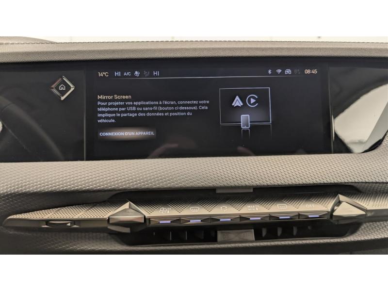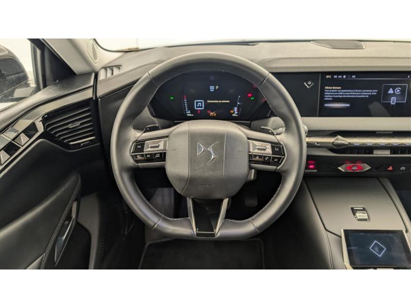 ABS avec répartiteur électronique de freinage (REF) et Aide au Freinage d'Urgence (AFU) + Aide au démarrage en penteAccès et démarrage mains libres ProximityAccoudoir central AR avec trappe à ski et 2 porte-gobeletsAccoudoir central AV réfrigéré et éclairéAide au stationnement AV et AR et Caméra de reculAirbags frontaux (passager déconnectable), latéraux AV, rideaux aux places AV/AR et central entre les places AVAlerte Attention ConducteurAlerte de franchissement involontaire de ligneAllumage automatique des feuxAvertisseur de risque de collisionBanquette AR 2/3 - 1/3 avec 3 appuie-têteBanquette AR avec trappe à skisClean Cabin avec Air Quality SystemClimatisation automatique bi-zoneCombiné numérique 7"Commutation automatique des feuxCondamnation automatique des portes et du coffre en roulantConsole centrale avec rangement ferméContrôle dynamique de stabilité (ESP) avec antipatinage des roues (ASR) + Contrôle de stabilité de l'attelageCoques de rétroviseurs extérieurs noir brillantDétection de sous-gonflageDS Drive Assist et Pack Détection Trafic AR : Adaptive Cruise Control Stop & Go Surveillance d'angles morts longue distance Alerte de Trafic AR Lane Positioning Assist afin de gérer la conduite de manière semi-autonomeDS EXTENDED HEAD UP DISPLAY Affichage tete haute étenduDS IRIS SYSTEMDS MATRIX LED VISIONDS SMART TOUCHDS Wings chroméesEclairage d'ambiance à LEDEclairage de cave à pieds à LEDEcran tactile capacitif 10" HDEnjoliveurs supérieurs des vitres latérales chromésEssuie-vitre AV à déclenchement et cadencement automatiquesFeux AR Full LED effet 3D avec traitement écaillesFixations ISOFIX à la place passager AV et aux places latérales ARFrein de stationnement électrique automatiqueFreinage d'urgence automatiqueIntérieur Cuir grainé Noir Basalte et Toile DS : Ciel de pavillon clair Décors de panneaux de porte Chrome guilloché Volant en cuir fleur Mistral Console centrale en Toile DS Mistral Planche de bord en toile DS Noir Basalte façon écaille Panneaux de portes Jantes alliage 19" SEVILLAKit de dépannage provisoire de pneumatiquesLève-vitres AV/AR électriques, séquentiels et antipincementLunette AR chauffanteMirror Screen sans fil via Wifi Compatible Apple CarPlay et Android AutoPack Sièges mécaniques avec réglages lombaires conducteur et passagerPalettes au volantPare-brise teinté acoustiquePare-soleil avec miroirs de courtoisie occultables éclairés à LEDPoignées extérieures affleurantes chroméesPrédisposition pour roue de secours galetteRégulateur/Limiteur de vitesseRétroviseur intérieur électrochrome sans cadreRétroviseurs extérieurs électriques, dégivrants, rabattables électriquement Avec éclairage d'accueilRadio numérique terrestre (DAB) Inclut le BluetoothReconnaissance étendue des panneaux de circulationReconnaissance des panneaux de vitesse et préconisationSeuil de coffre aluminiumSOSVitres AR et lunette AR surteintéesVolant réglable en hauteur et profondeur