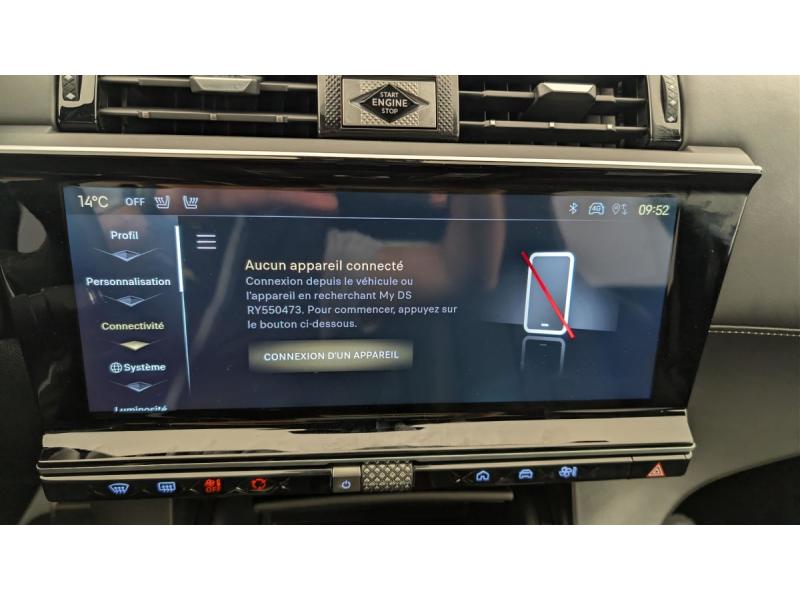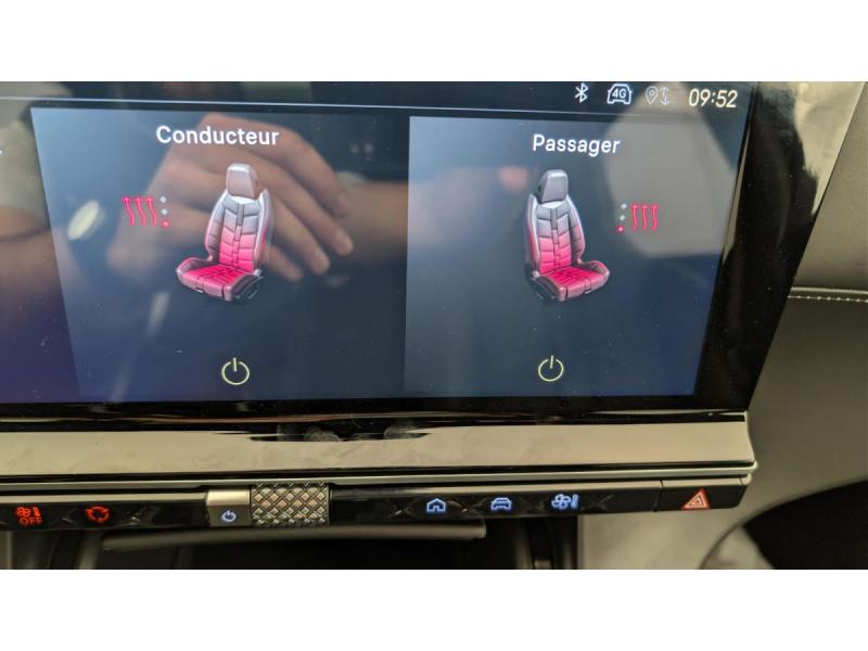 ABS avec répartiteur électronique de freinage (REF) et Aide au Freinage d'Urgence (AFU) + Aide au démarrage en penteAccès et démarrage mains libresAccoudoir central ARAccoudoir central en Toile DS avec rangementAide au stationnement AV/AR et Caméra de reculAirbags frontaux (passager déconnectable), latéraux AV, rideaux AV/ARAlerte Attention ConducteurAlerte de franchissement involontaire de ligneAllumage automatique des feux Avec commutation automatique des feux de routeBanquette AR 2/3 - 1/3Barres de toit aluminiumBoîte à gants ventiléeCombiné numérique 12.3" HDContrôle électronique de stabilité de l'attelageContrôle dynamique de stabilité (ESP) avec antipatinage des roues (ASR)Détection de sous-gonflageDouble canule d'échappement chroméeDS Drive AssistDS IRIS SYSTEM Système d'infotainment personnalisable de dernière générationDS LIGHT VEIL Feux de jour à LEDDS PIXEL LED VISION 3.0Eclairage d'accueil et d'accompagnementEclairage de cave à pieds à LEDEclairage PolyAmbientEcran tactile capacitif 12’’ HDEntourage des vitres latérales chroméEssuie-vitre AV à déclenchement et cadencement automatiques + Buses de lavageFixations ISOFIX à la place passager AV et aux places latérales AR Inclut TOP TEATHERFrein de stationnement électrique automatiqueFreinage d'urgence automatique piloté par caméra et radarGrille de calandre noir brillant avec pampilles chroméesHayon motorisé avec Accès Bras ChargésJantes alliage 19'' EDINBURGH, pneus 235/50 R19 VJonc sur jupe AR chroméKit de dépannageLève-vitres AV/AR électriques, séquentiels et avec fonction antipincementMirror Screen sans fil via Wifi Compatible Apple CarPlay et Android AutoMontre rotative B.R.M. R180Navigation 3D ConnectéePédalier et le repose-pied aluminiumPalettes au volantPare-brise teinté acoustiquePoignées extérieures couleur caisse avec insert chroméPrises 12 V 1 prise dans le rangement AV de la console centrale et 1 prise dans le coffrePrises USB 1 prise USB type C dans le rangement de la console centrale et 2 prises USB type A pour les passagers ARRégulateur/Limiteur de vitesseRétroviseur intérieur électrochrome sans cadreRétroviseurs extérieurs électriques dégivrants, rabattables électriquement Fonction électrochrome côté conducteur, Projection au sol du logo DS, Indexé à la marche AR côté passagerRétroviseurs extérieurs avec embase couleur caisse et coque noir brillantRadio numérique terrestre (DAB)Reconnaissance étendue des panneaux de signalisationSélecteur de mode de conduiteSabot AV chroméSièges AV électriques Réglage électrique du siège, réglage lombaire pneumatique, réglage mécanique du nez de coussinSièges AV chauffantsSOS & AssistanceSurveillance d'angles mortsToit ouvrant panoramique électriquee Entrebaillant, Ouvrant, Occulteur motoriséVérins d'ouverture et de maintien du capot moteurVitres AR et lunette AR surteintéesVitres latérales feuilletées acoustiquesVolant réglable en hauteur et profondeur