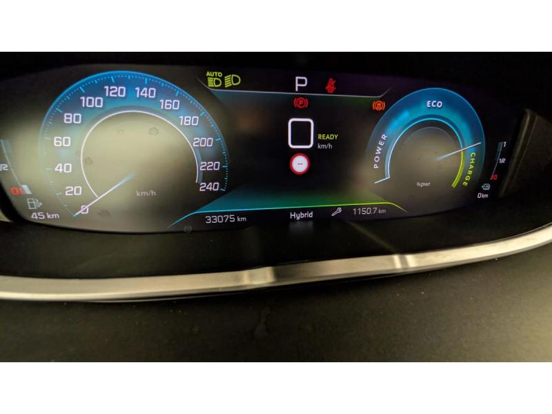 6 airbags (Frontaux adaptatifs, latéraux AV, rideaux AV/AR)Accès et démarrage mains libresAccoudoir central AV à ouverture papillon, avec compartiment de rangement éclairé et réfrigérableAir conditionné automatique bi-zone avec aérateurs aux places ARAppuis-tête à sécurité optimisée réglables en hauteur (conducteur, passager et AR x3)Avertisseur de temps de conduiteAvertisseur sonore audible depuis l'extérieur pour la sécurité piétonsBanquette AR rabattable 1/3 - 2/3 avec accoudoir central, trappe à skis et commandes de rabattement depuis le coffreCâble de recharge T2 mode 2 (10 A / 2,3 kW)Calandre á damiers chromésChargeur embarqué 3,7kWCoques de rétroviseurs extérieurs Noir Perla NeraDécors de planche de bord et panneaux de portes en maille "Brumeo"Détection de sous-gonflage indirecteDirection assistée électrique, colonne de direction réglable en hauteur et profondeur (mécanique)Enjoliveur d'arc de pavillon en Inox BrillantEnjoliveurs d'ailes AV chromésEssuie-vitre AV avec système de lavage "Magic Wash"Fixations ISOFIX (passager AV et aux places latérales AR)Fonction "Mirror Screen" (Apple CarPlay / Android Auto )Frein de stationnement électrique avec aide au démarrage en pente et serrage automatiqueGarnissage TEP avec Tissu Colyn MistralIndicateur de rapport conseilléJantes alliage 18" diamantées DETROIT bi-ton Gris Storm brillant avec pneumatiques 225/55 R18 102 VKit de dépannage de pneumatique : compresseur 12 volts, flacon de produit de colmatage, anneau de remorquage, deux cales de roue, manivelle de frein de stationnement électriqueLève-vitres AV/AR électriques et séquentiels avec antipincementNavigation 3D connectée avec écran tactile capacitif 10" HD Avec reconnaissance vocale, cartographie EuropePack City 1 : Aide graphique et sonore au stationnement AV Aide graphique et sonore au stationnement AR Visiopark 1 : caméra de recul avec restitution sur l'écran tactile d'une vue AR et d'une vue de dessus de l'environnement AR du véhiculePack Safety Plus : Alerte Risque de Collision (Distance Alert) Alerte attention conducteur Commutation automatique des feux de route / feux de croisement Alerte active de franchissement involontaire de ligne et bas côté Freinage d'urgence automatique avec caméra & radarPack Visibilité : Eclairage d'accompagnement automatique Allumage automatique des feux de croisement Essuie-vitre AV à déclenchement automatiquePares-soleil avec miroirs de courtoisie éclairésPassages de roues rapportés Noir MatPEUGEOT Connect SOS & AssistancePeugeot i-Cockpit avec combiné tête haute numérique, volant compact multi-fonctionsPlafonniers AV/AR à LED avec 2 spots de lecturePlancher de coffre fixe avec articulation pour accès au coffre de rangement du câble de rechargePoches/filets aumonières au dos des sièges AVPrise 12 V (x3 : zone connectique, AR de console et coffre)Projecteurs "Peugeot LED Technology" avec feux diurnes à LED sous projecteursRégulateur / Limiteur de vitesseRétroviseur intérieur photosensibleRétroviseurs extérieurs dégivrants avec réglage et rabattement électriques, éclairage d'accueil à LED, témoin de surveillance d'angles mortsReconnaissance étendue des panneaux de signalisationSécurité enfants électrique des vitres ARSélecteur de modes de conduite (Electric, Hybrid, Sport)Sabot de pare-chocs AV peint MétallureSiège conducteur avec réglage lombaireSièges AV réglables en hauteurToggle Switches chromés (touches piano d'activation des fonctions de l'écran tactile)Trappe de recharge électrique avec indicateur d'état de chargeVitres latérales AR et lunette AR chauffante surteintéesVolant Cuir fleur Mistral