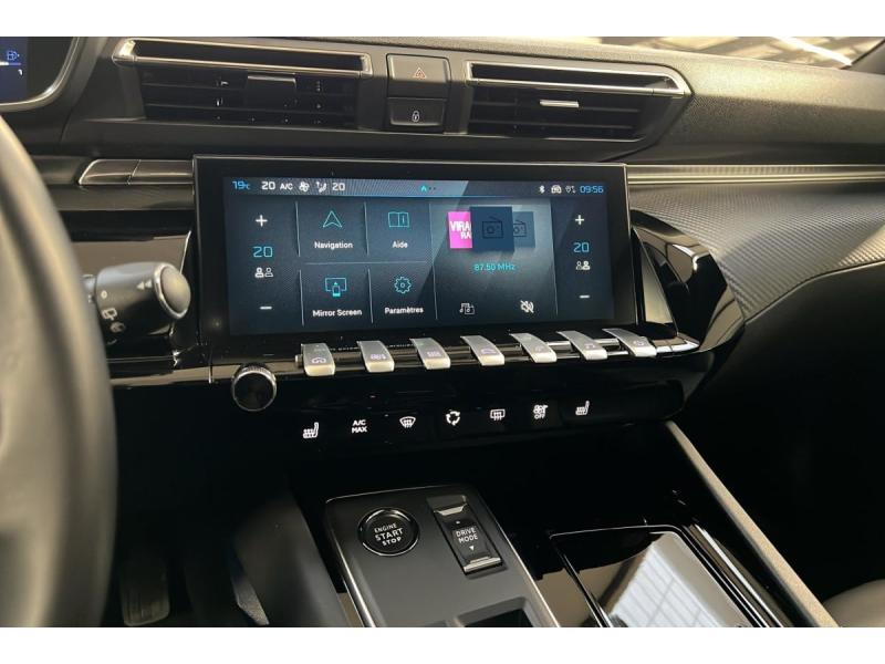 6 airbags (Frontaux adaptatifs, latéraux AV, rideaux AV/AR)Accès et démarrage mains libresAccoudoir central AV en TEP à ouverture papillonAide au stationnement AR, AV et latérale (graphique et sonore)Air conditionné automatique bi-zoneAppuis-tête à sécurité optimisée réglables en hauteur (conducteur, passager et AR x3)AVAS (système d'alerte sonore du véhicule émis à faible allure en roulage électrique, audible depuis l'extérieur pour la sécurité des piétons)Avertisseur de temps de conduiteBanquette AR rabattable 1/3 - 2/3 avec accoudoir central, trappe à skis et commandes de rabattement depuis le coffreBarres de toit longitudinales Noir BrillantCâble de recharge T2 mode 2 (10 A / 2,3 kW)Coques et embases de rétroviseurs extérieurs Noir brillantDétection de sous-gonflage indirecteDirection assistée électrique, réglable en hauteur et profondeur (mécanique)Eclairage intérieur LED : Plafonniers AV et AR avec 2 spots de lecture, Pare soleil avec miroirs de courtoisie éclairés, rangements, caves à piedsFeux arrière Full LED avec indicateurs de direction défilantsFixations ISOFIX aux places latérales ARFonction DAB (Radio Numérique Terrestre)Fonction Mirror Screen (Apple CarPlay / Android Auto ) sans filFrein de stationnement électriqueJantes alliage 17" Merion bi-ton diamanteesKit de dépannage de pneumatiquePack Safety Plus : Freinage d'urgence automatique avec caméra & radar Système de surveillance d'angle mort Reconnaissance étendue des panneaux de signalisation Alerte risque de collision et Alerte attention conducteur Alerte de franchissement involontaire de lignePack Visibilité : Eclairage d'accompagnement automatique Allumage automatique des feux de croisement Essuie-vitre AV à déclenchement automatiquePeugeot Connect SOSPeugeot i-Cockpit avec combiné numérique tête haute 12,3"Peugeot i-Connect Advanced - Navigation 3D connectée (cartographie Europe) avec écran tactile 10" HD - Reconnaissance vocale en langage naturelProgramme de Stabilité Electronique (ESC) Avec antipatinage des roues (ASR), antiblocage des roues (ABS), répartiteur électronique de freinage (REF), assistance au freinage d'urgence (AFU), contrôle dynamique de stabilité (CDS) et contrôle de stabilit&eacProjecteurs Peugeot Matrix LED Technology Eclairage adaptatif avec correction automatique de site, 3 modes (Routes, Autoroutes et Brouillard) et feux diurnes 3 griffes à LED intégrés aux projecteursRégulateur / limiteur de vitesse avec Préconisation Limitation de VitesseRétroviseur intérieur électrochromeRétroviseurs extérieurs électriques et dégivrants, rabattables électriquement avec éclairage d'accueil à LED, témoins de surveillance d'angles mortsSélecteur de boite de vitesses automatique e-ToggleSélecteur de modes de conduite 'Drive Mode' (Electric, Hybrid, Sport)Sellerie mi-TEP / Tissu Falgo avec surpiqures QuartzSièges conducteur et passager réglables en hauteur, avec réglage lombaire électrique (4 voies)Toggle Switches' chromés (touches 'piano' d'activation des fonctions de l'écran tactile)VisioPark 1 Caméra de recul Haute Définition 180° avec restitution sur l'écran tactile d’une vue AR et d'une vue de dessus de l'environnement AR du véhiculeVitres latérales AR et lunette AR surteintéesVolant cuir fleur avec commandes intégrées